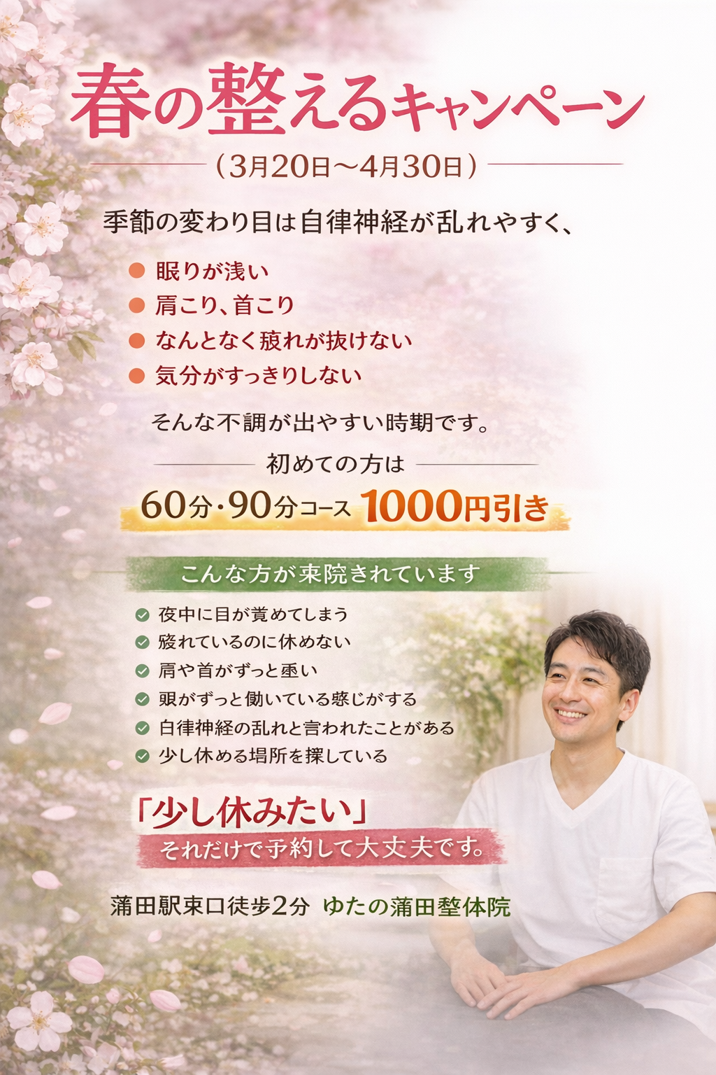 ※ 表示時間には、着替え・体調確認・施術・お帰りの準備を含みます。