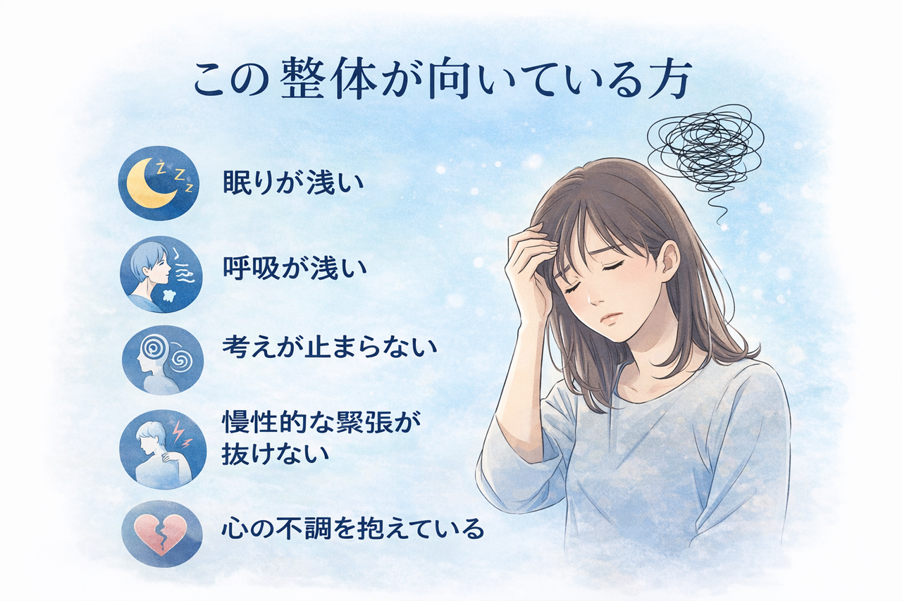 結果、「副交感神経優位」に戻すことにより、睡眠・内臓機能・ホルモン分泌が整い、根本的な回復へ導きます。