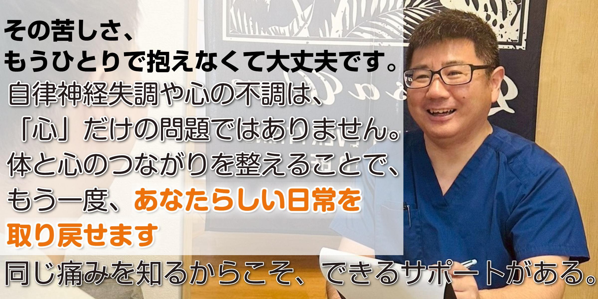 私自身、「うつ病」と「社交不安障害」で心と体の不調に悩んだ経験があります。いやむしろ、今も悩んでいます。だからこそ、あなたの心の、そして身体の痛みがよくわかるのです。それこそが「ゆたの蒲田整体院」の大きな特徴といっていいでしょう。