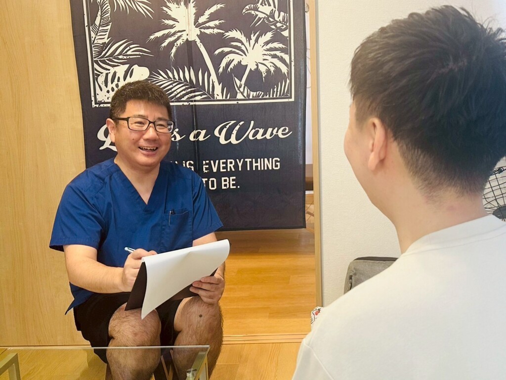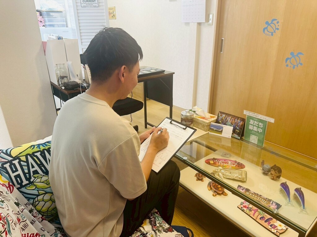 まずは、カウンセリングシートに現在のお身体の状態、一番何に困っているのか、また、これまでの通院・お怪我の経験などを記載してもらいます。言葉にしにくい場合は、カウンセリングの中で伺いますので、難しく考えなくても大丈夫。今のあなたの素直な気持ちを記載ください。