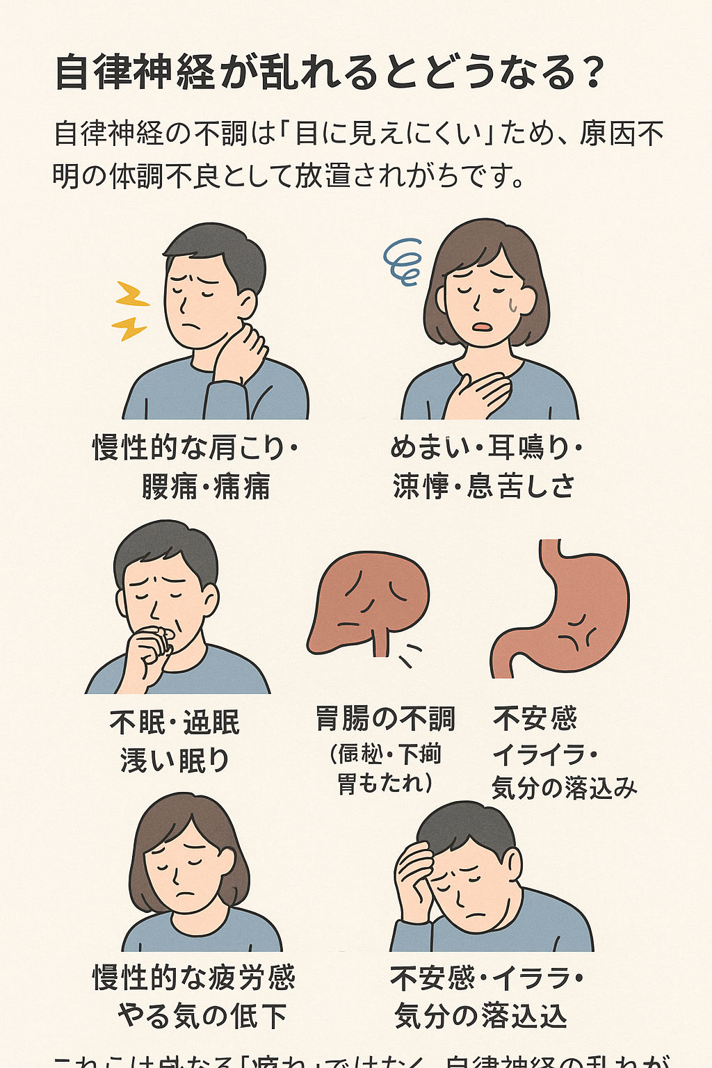 これらは単なる「疲れ」ではなく、自律神経の乱れが背景にあることが少なくありません。