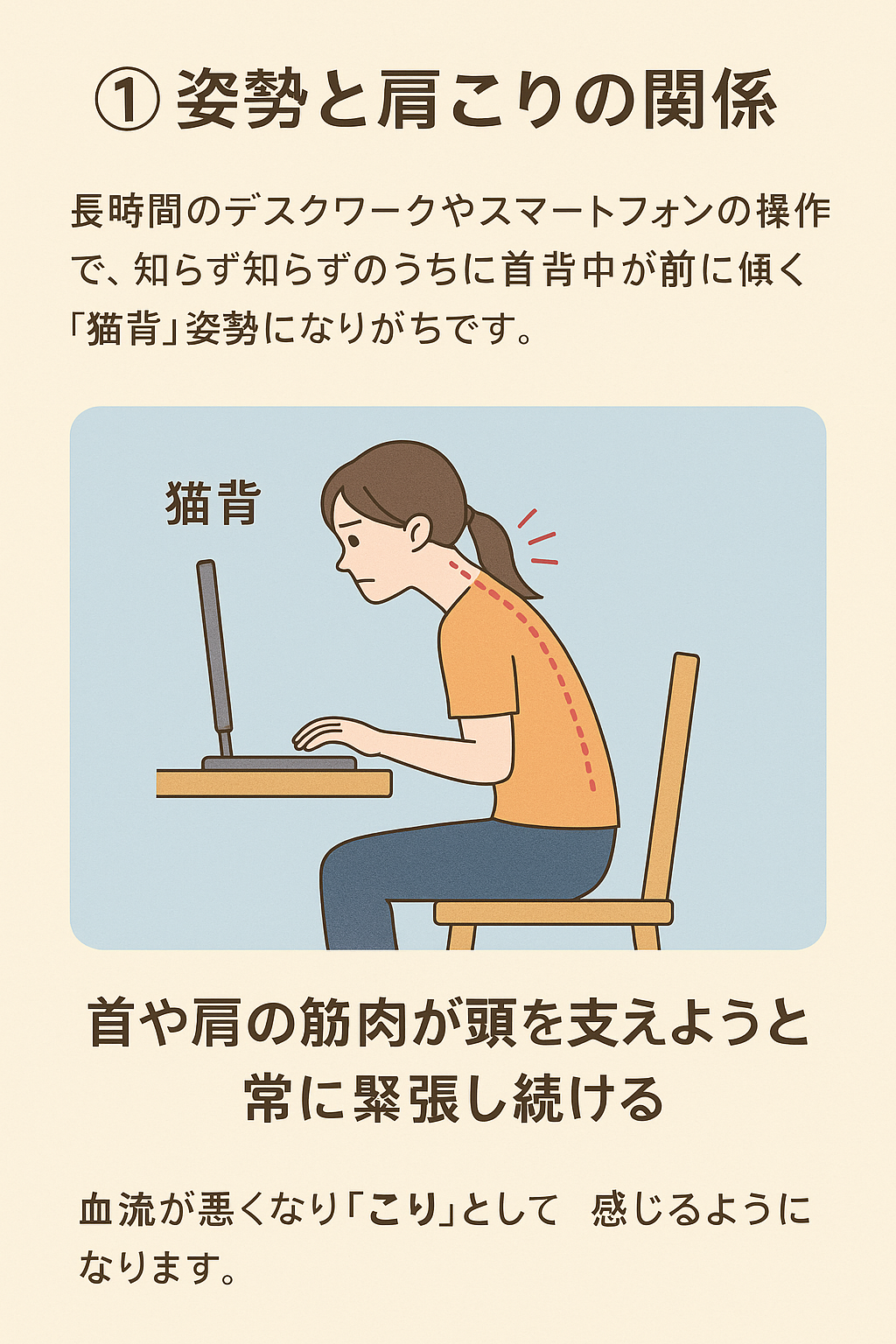 これが毎日続けば、筋肉が硬くなり、血流が悪くなって「肩こり」として現れるのです。
