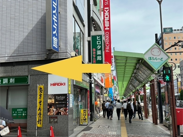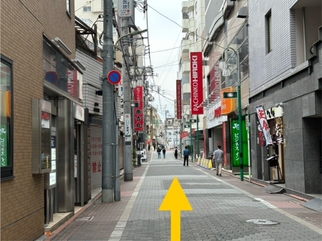細い路地に入り、そのまま真っすぐ進みます。右手にはビジネスホテルが見えます。