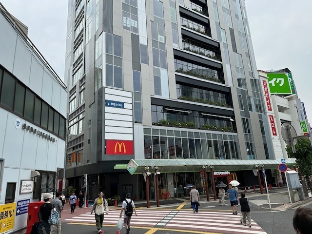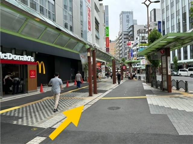 建物沿いに進むと、左手に交番、右奥にマクドナルドが見えるので、マックの方向へ横断歩道を渡ります。