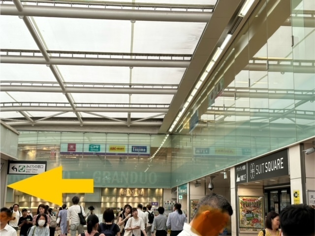 改札を出て左を向いた図。駅ビルがありますが、中には入らずに更に左に曲がると東口出口が見えてきます。