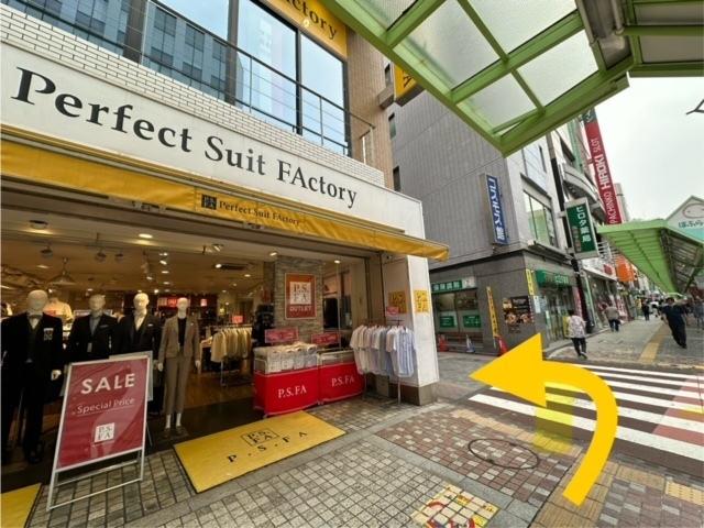 少し進むと左手にスーツ屋さんがある角が見えるので、左折します。